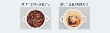 - 焦げつき消火機能がトロ火を使う煮込み料理などの焦げつきの不安を解消。安心してじっくりと煮込めます。